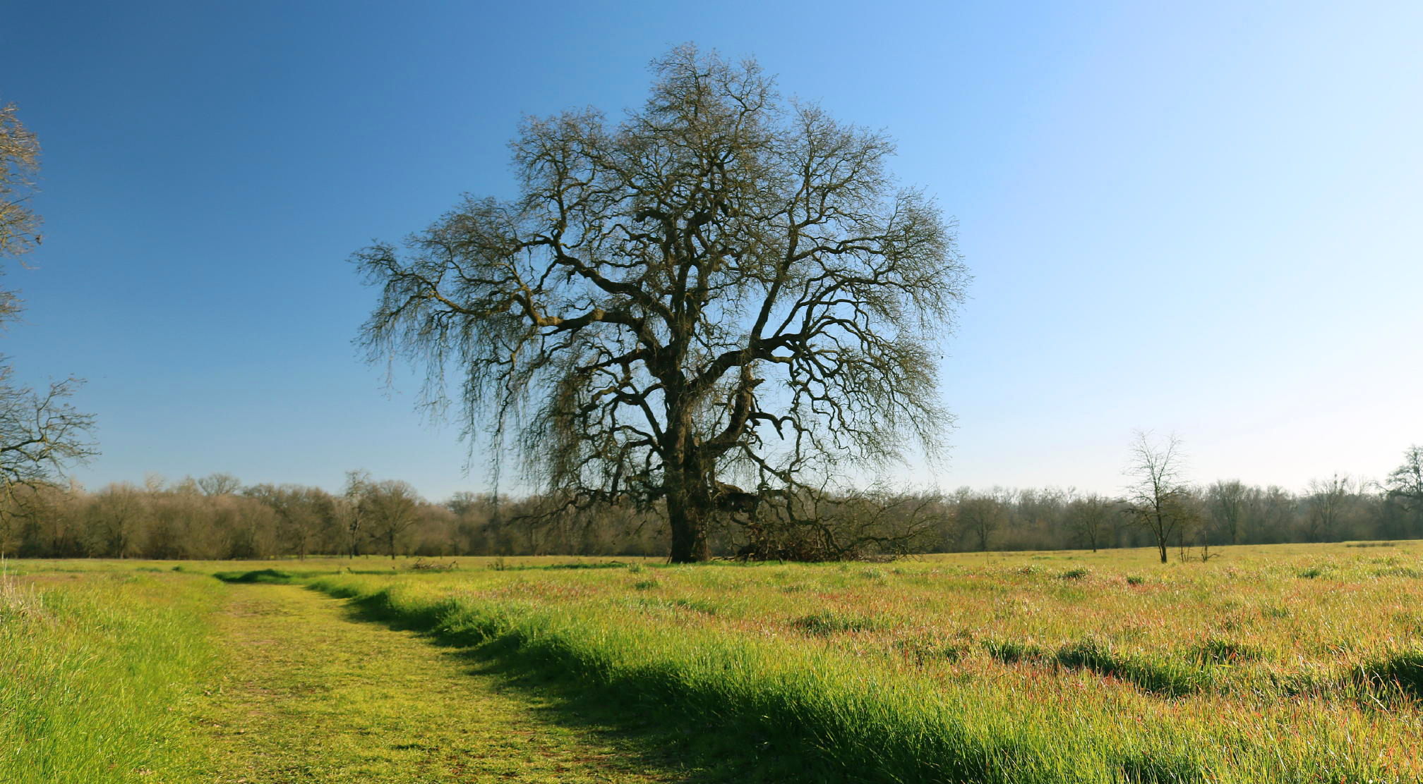 In mid-winter, the low angle of afternoon sun accentuates the impressive structure of giant (bare) Oaks, contrasting nicely with fresh green grass. In any decent rain season here, spring grass is out by late November.