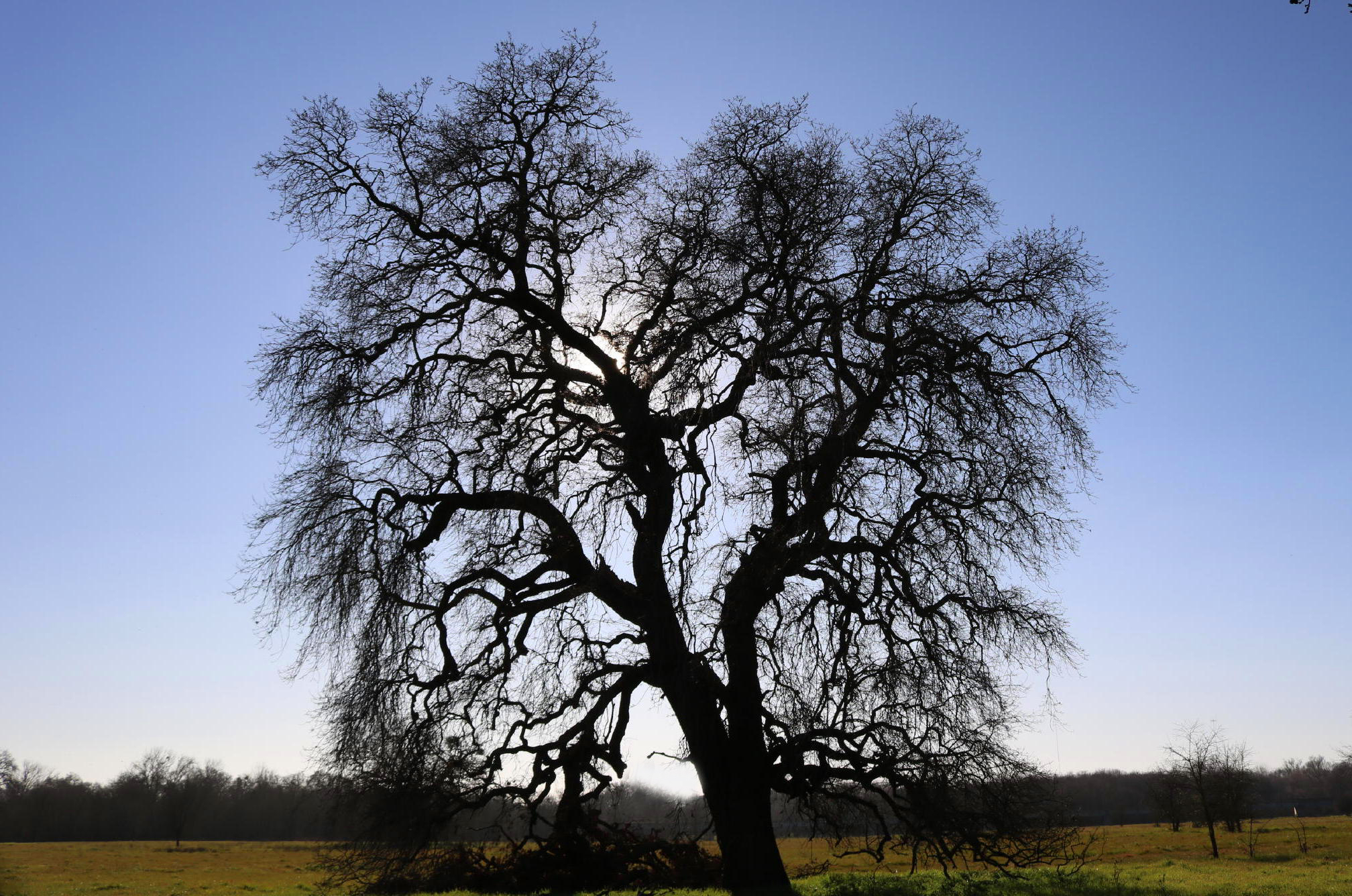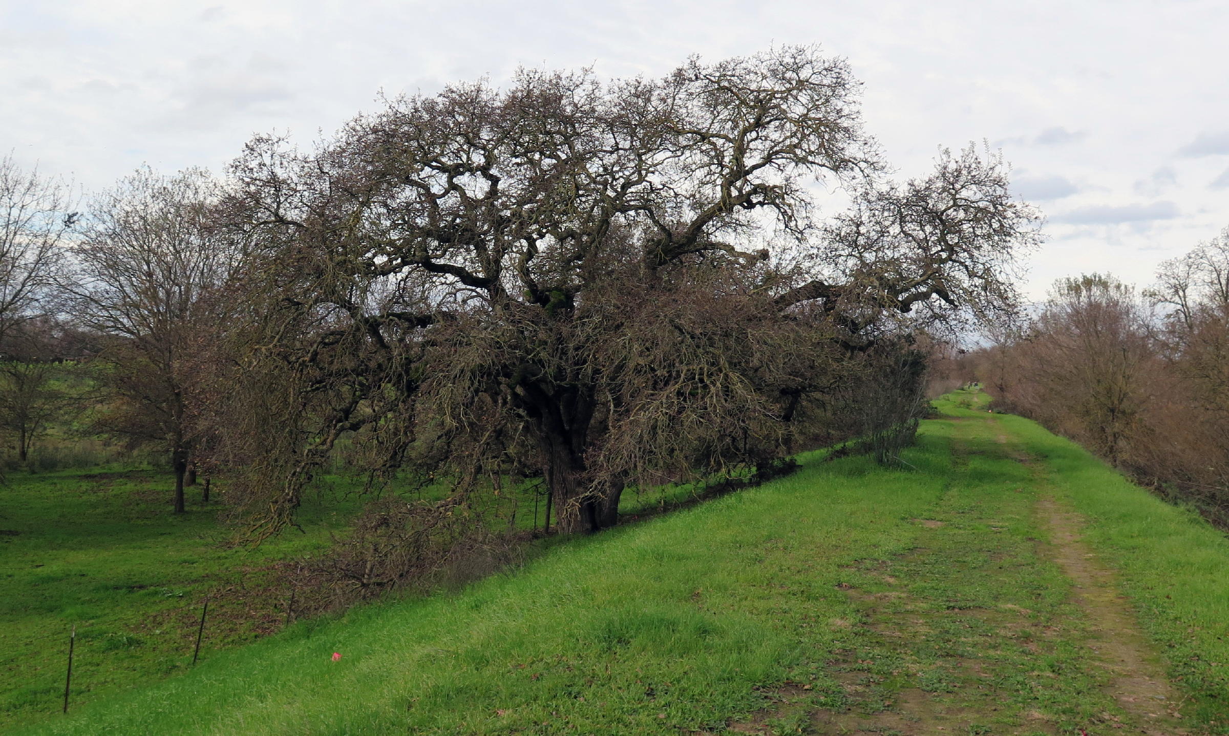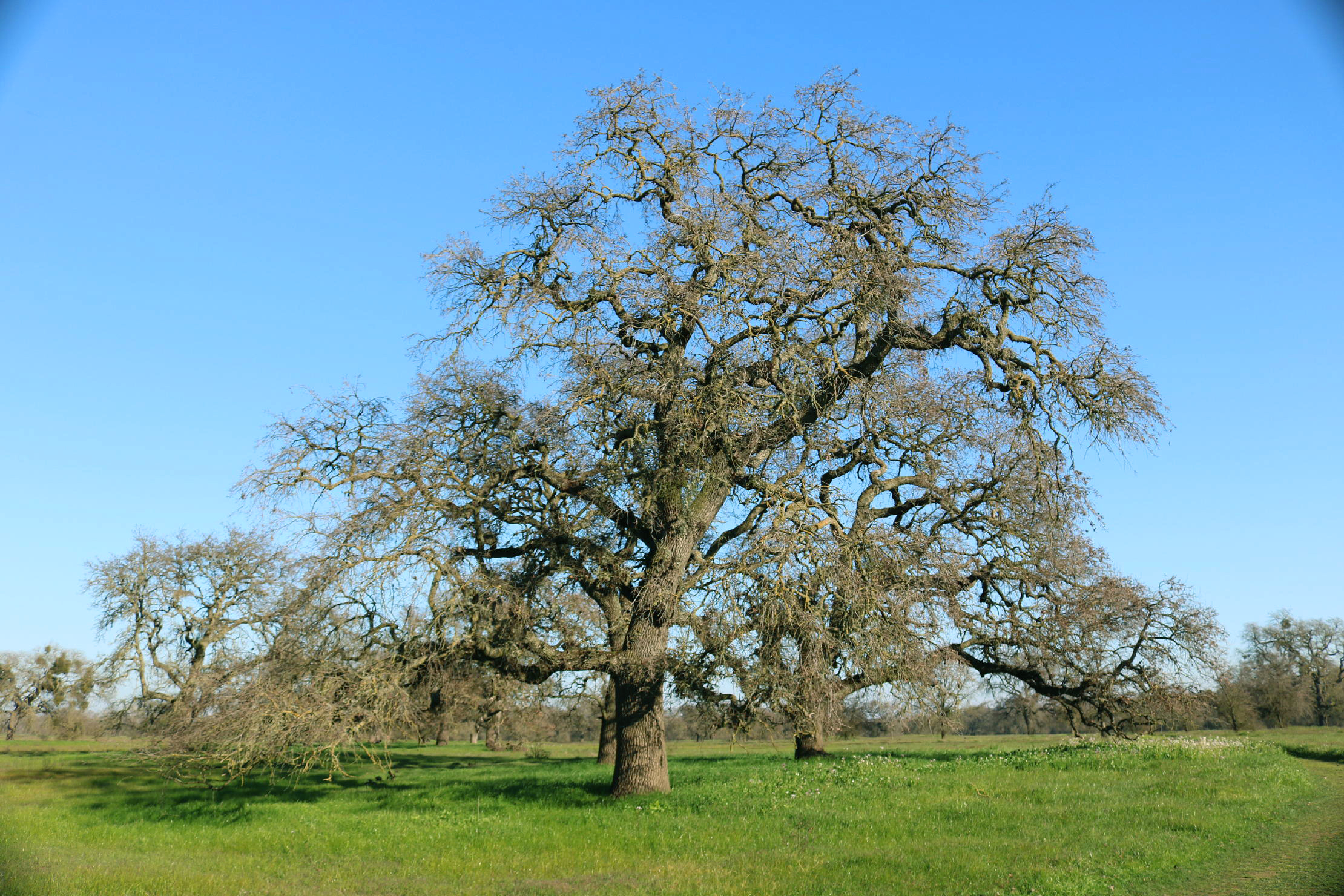 In mid-winter, the low angle of afternoon sun accentuates the impressive structure of giant (bare) Oaks, contrasting nicely with fresh green grass. In any decent rain season here, spring grass is out by late November.