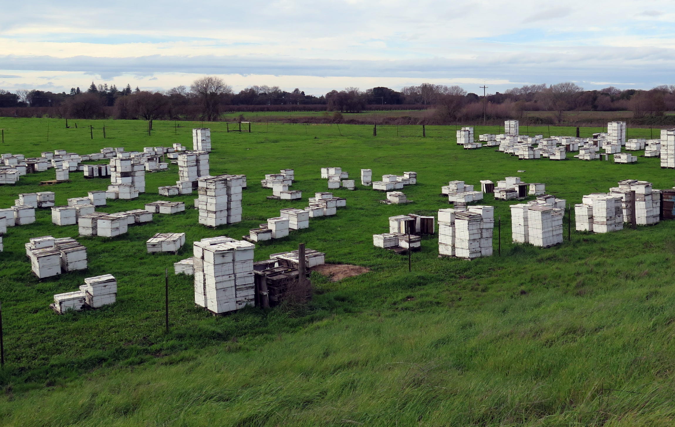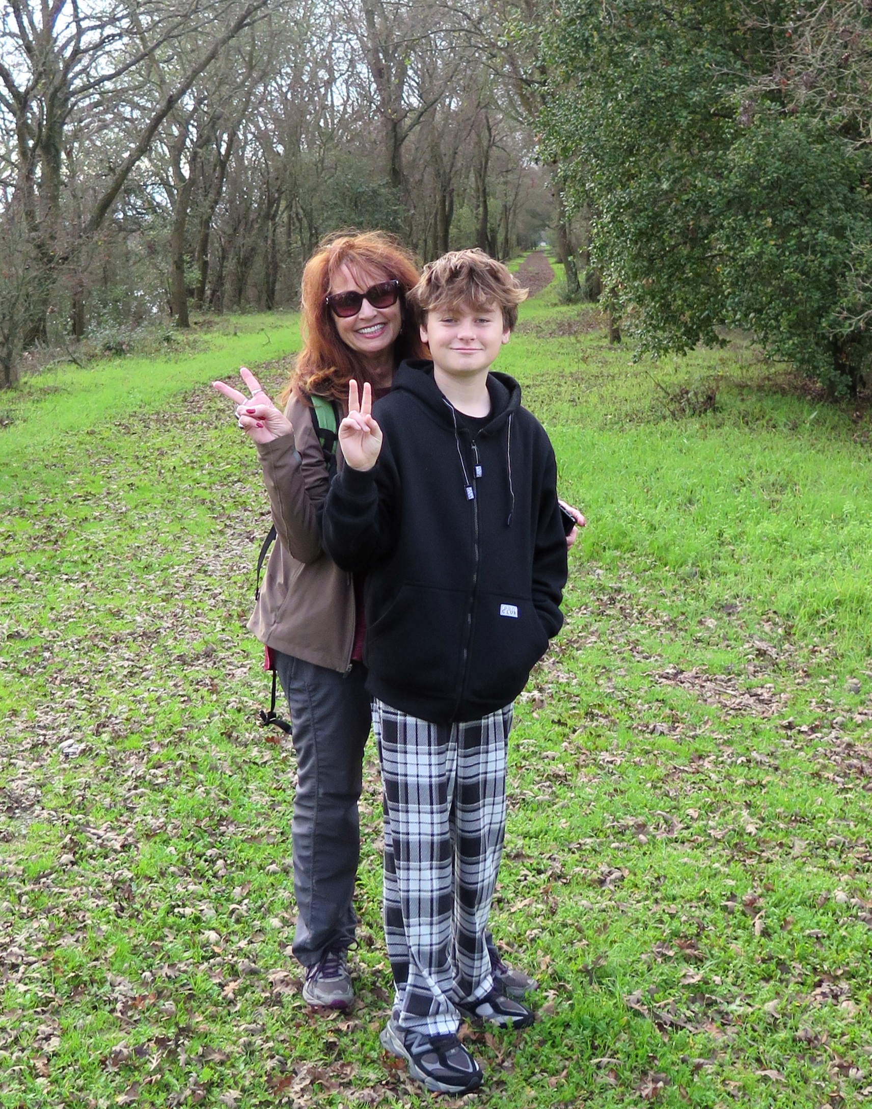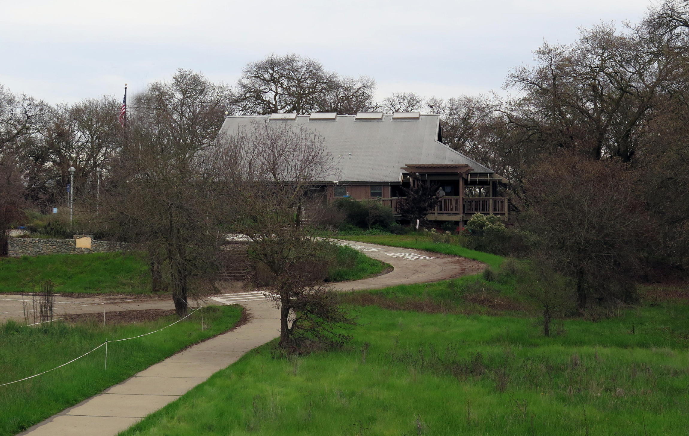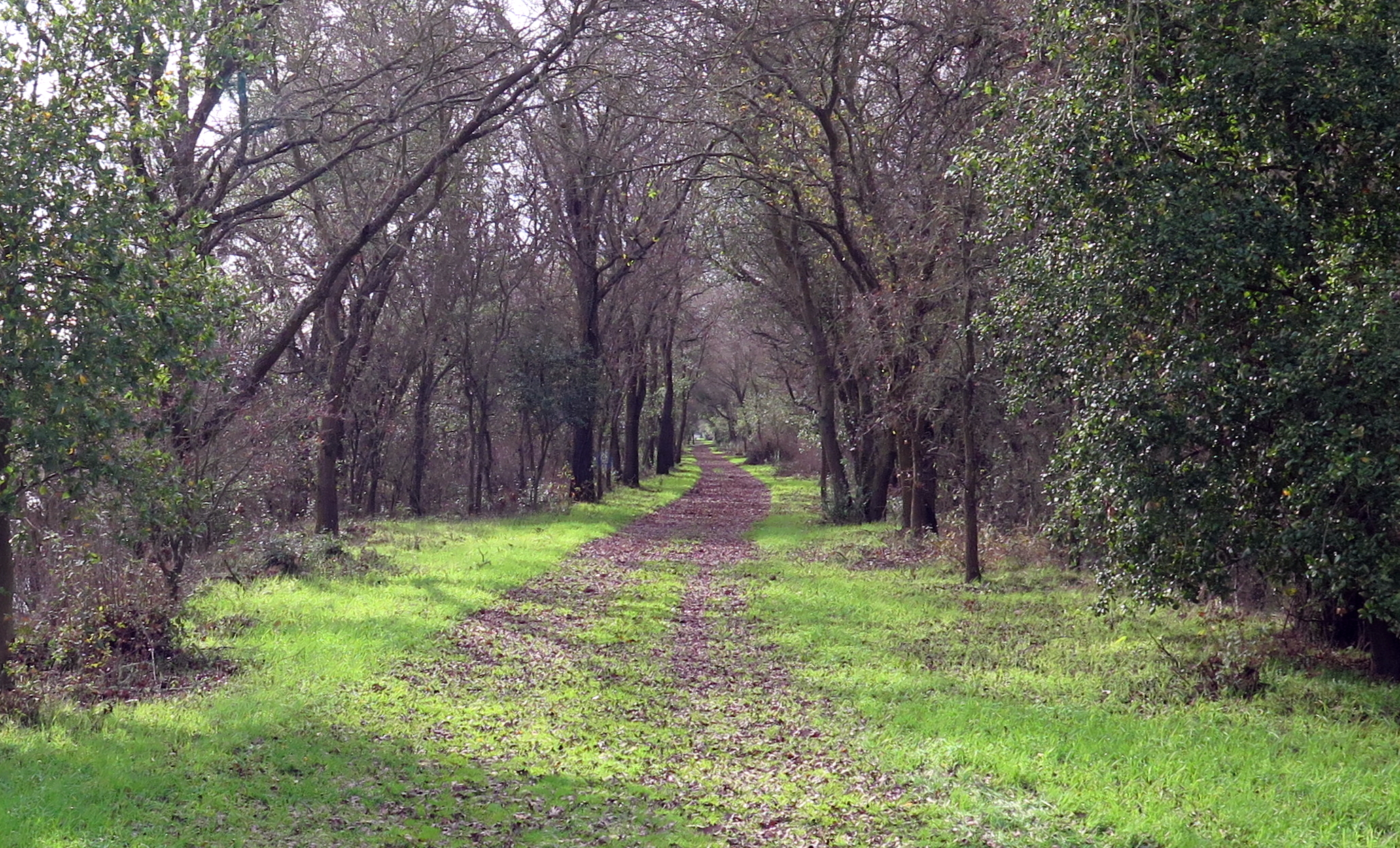 In mid-winter, the low angle of afternoon sun accentuates the impressive structure of giant (bare) Oaks, contrasting nicely with fresh green grass. In any decent rain season here, spring grass is out by late November.